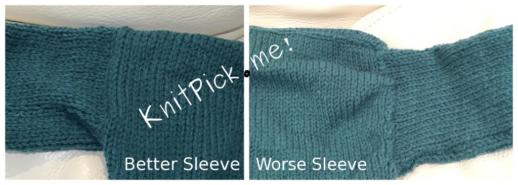 Even though there is one that is better than the other, both sleeves are too slim for an adult person well formed arm (if someone was thin enough to fit the sleeves with their upper arm their forearms would be swimming in yarn, because it has no adequate shape).