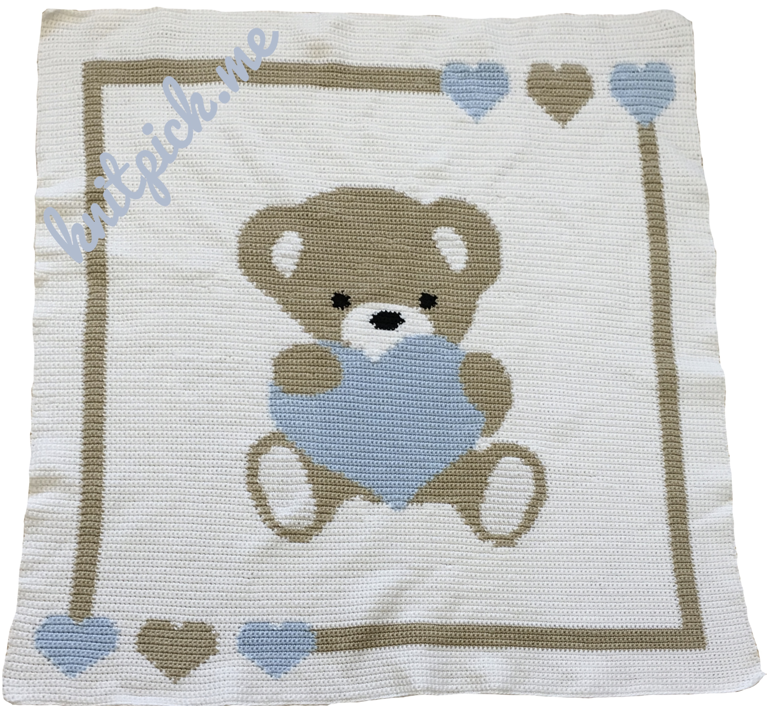 The pattern used for the blanket is from Elena Balyuk, Sweet Heart Baby Blanket. I followed the chart that comes with the pattern, the stitches were simple enough that no big explanations were required for me. It is cumbersome only in terms of changes of color throughout (I would advice to become familiar with changing colors neatly and hiding away ends in your crochet before attempting to undertake this project... there were a lot of ends to tidy up!). It is simple and easy to make otherwise, lots of fun and a very rewarding project.