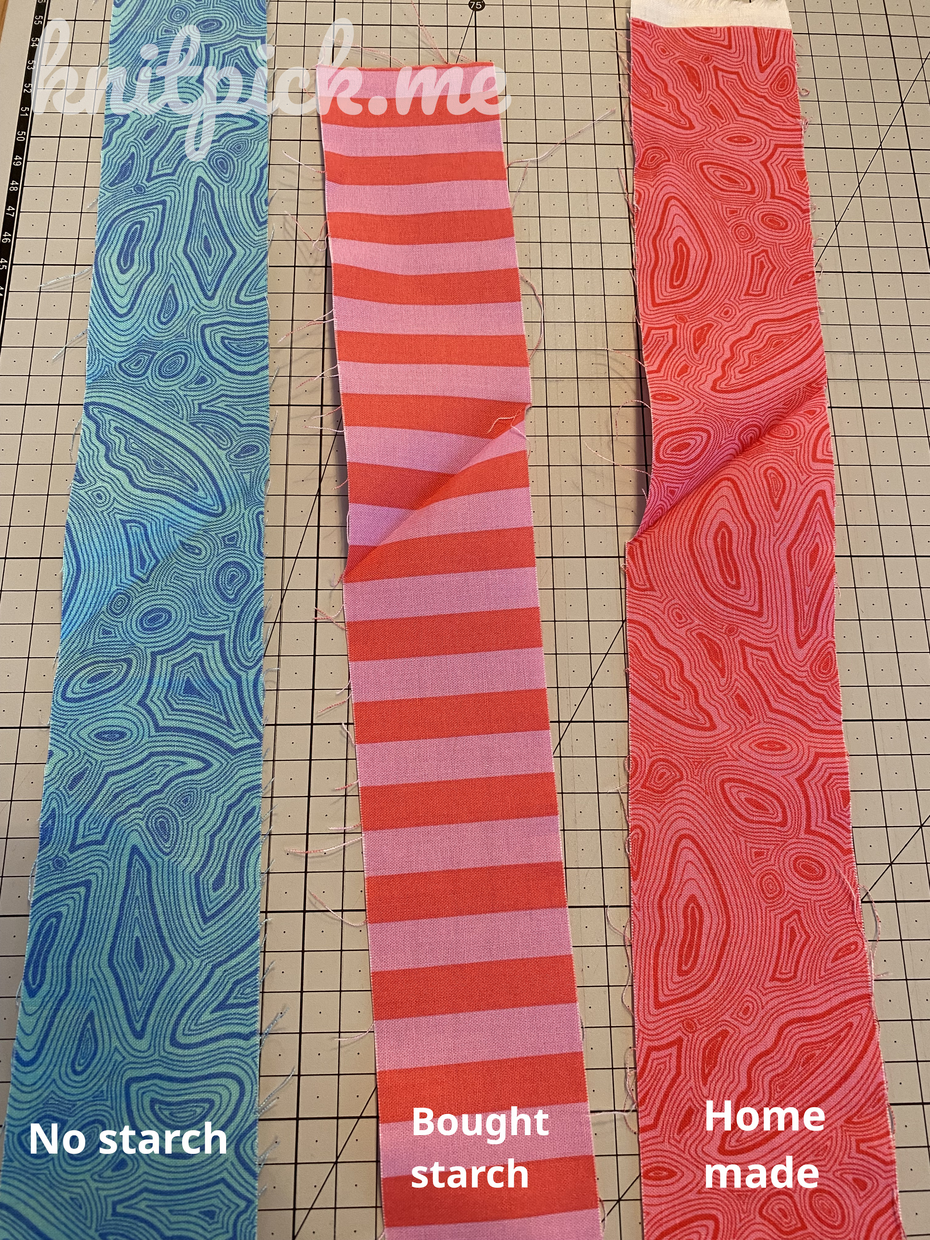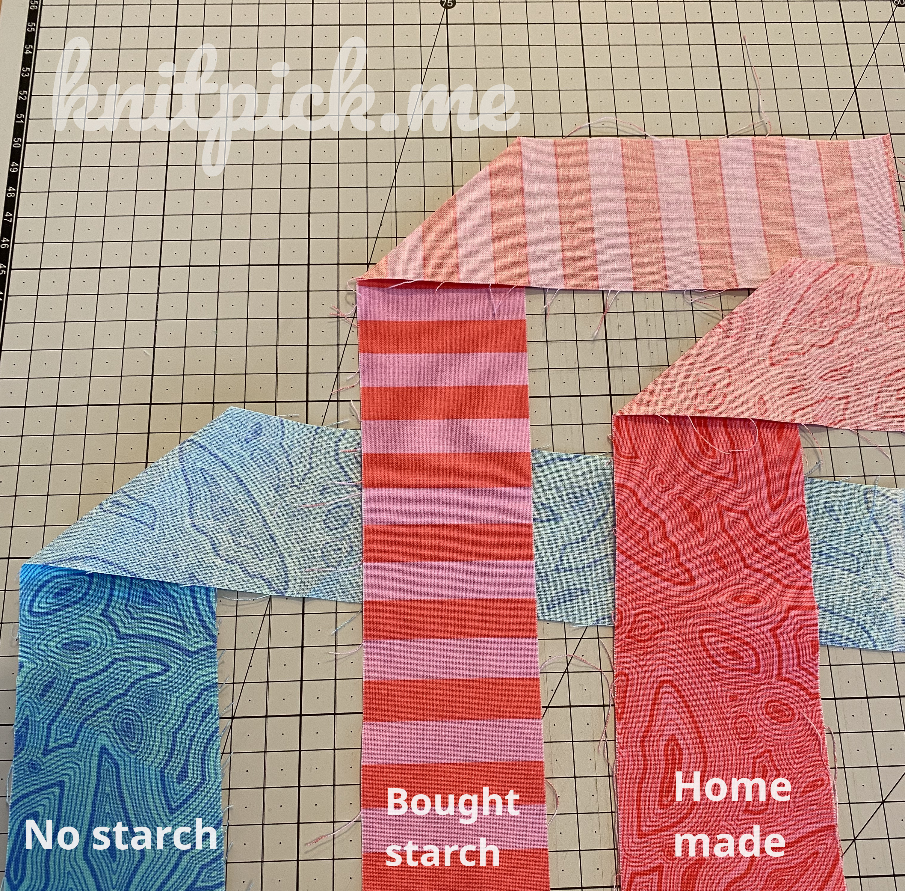 She taught me about starching. Never starched my fabric before, so I decided to test whether it would be worth it and how expensive it would get. I cannot stand chemical smells, so I bought a Best Press bottle scent free (red stripes piece). It was awesome but unaffordable at the rate my fabric was drinking it. So my partner prepped a bit of home made one with potato starch (the other red fabric). Blue fabric is unstarched, like i would normally quilt/iron my fabric. Look at those ironed lines!!! From now on I am a starcher... and not just for FPP.